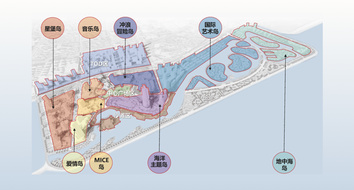 Magic Star Island Area is located to the west of Tingwei South Road in Seaside New Area, which is defined as a cultural and entertainment gathering place, includes Ocean Themed Island, Surfing Adventure Island, Music Island, MICE Island, Love Island and Starburg Island around the central garden.